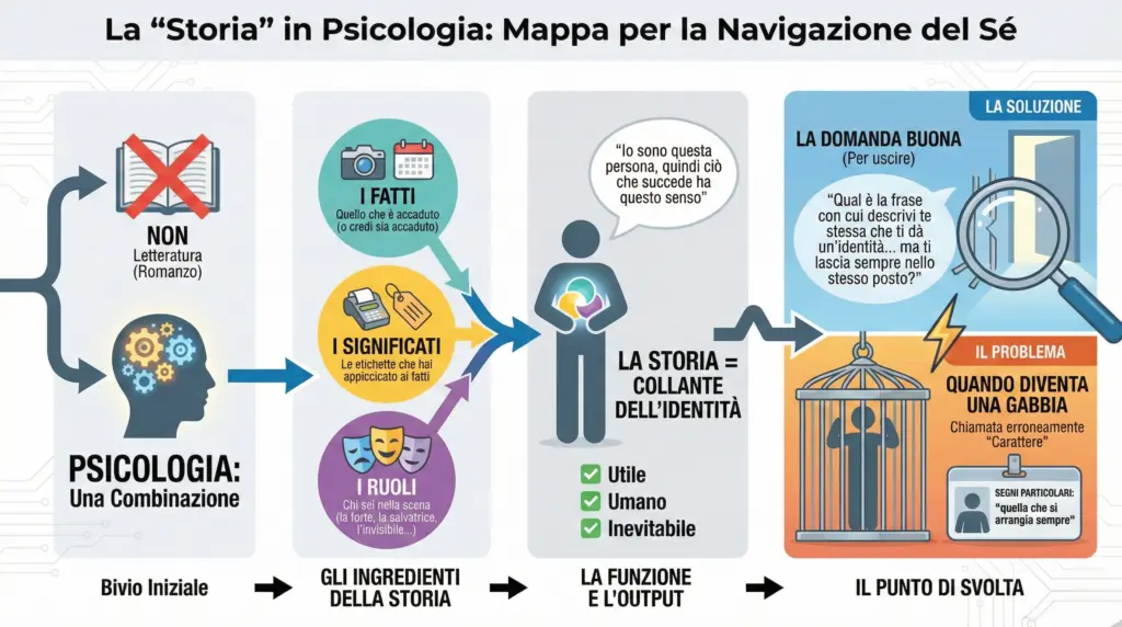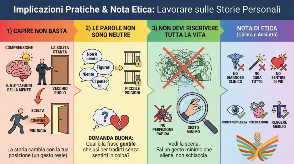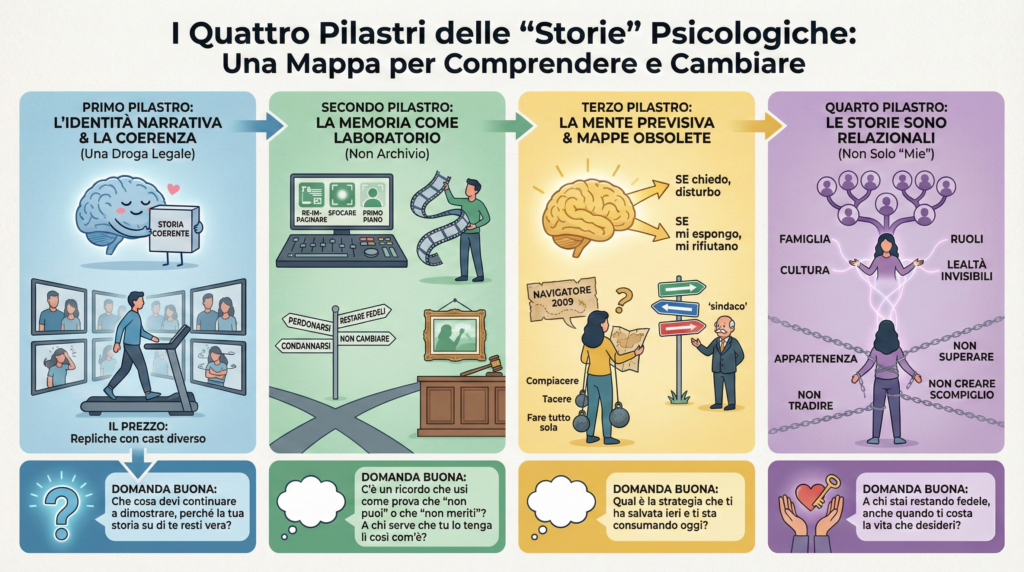 Lavorare sulle storie non è fare diagnosi, non è “curare” tutto, e non sostituisce percorsi clinici quando servono. È un lavoro di consapevolezza, linguaggio, scelte e integrazione.