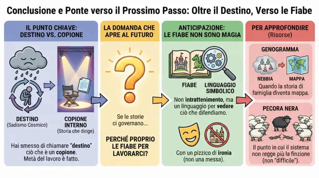 Perché se capisci questo punto — che la vita non si ripete per sadismo cosmico, ma perché una storia interna continua a dirigere la scena — hai già fatto metà del lavoro: hai smesso di chiamare “destino” ciò che è un copione.